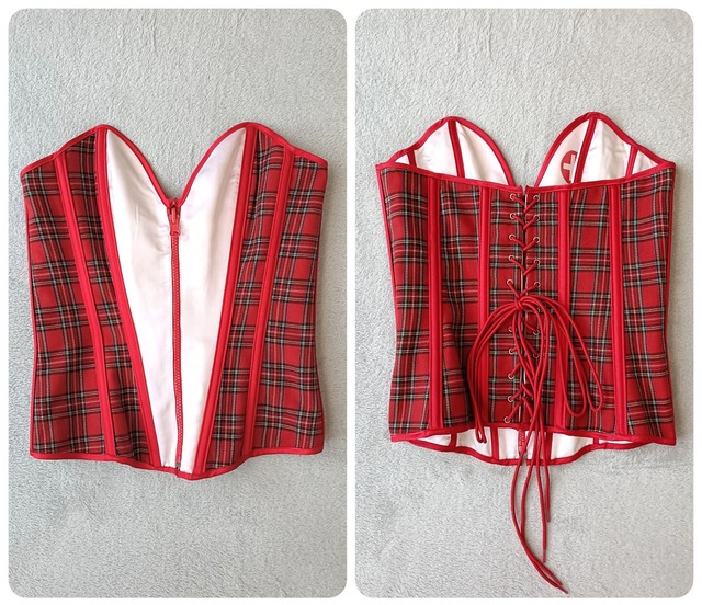 Fredericks of Hollywoodのリバーシブルコルセット。 ●タータンチェック生地+ホワイトサテン生地 ●ホワイトサテン生地+ナースマーク のリバーシブルになっております。 ハロウィンやコスプレ等にもいかがでしょうか☻ サイズ感はトルソー9号にレースアップを締めた状態でちょうどよいサイズ感です。紐を緩めたらニットの上などにも着れますし、L〜サイズくらいの方にでも合うかと思います。 ※リバーシブルですが、ホワイトサテン生地+ナースマークの方にブランドタグが取り付けられているため、こちら側で着用の際は切って着用お願いします。本縫いの上からタグつけられていますので切っても問題ないかと思います。 【サイズ】 表記サイズ:M 着用感:M〜サイズくらい ※着用感はあくまでも個人の感じ方のため参考程度にお願いします 【カラー】 赤のタータンチェック柄 ホワイトのサテン生地 【平置き実寸】 総丈:約40cm(一番長い箇所で計測) 身幅:約38cm(トルソーに着せた時の締め具合で計測) ※平置き採寸になりますので若干のずれが生じる場合がございます。予めご了承下さい。 【素材】 ポリエステル 【トルソーサイズ 9号】 ウエスト:64cm バスト :86cm ヒップ :84cm 肩幅 :38cm 【コンディション】A サテン生地部分がやや赤の染料移りで薄っすらピンクぽい色になっています。また、洗濯は手洗い可ですが、やや色が抜けるのであまり漬け置きせずに早めに脱水して乾かしてください。その他全体的に良好。 S 使用感やダメージがほぼなくキレイな状態 A 若干のダメージ・汚れがあるが全体的に綺麗 B 使用感があり、ダメージや汚れはあるが着用に支障なし C 全体的にヴィンテージ特有の使用感があり、目立つダメージや劣化等がある状態。