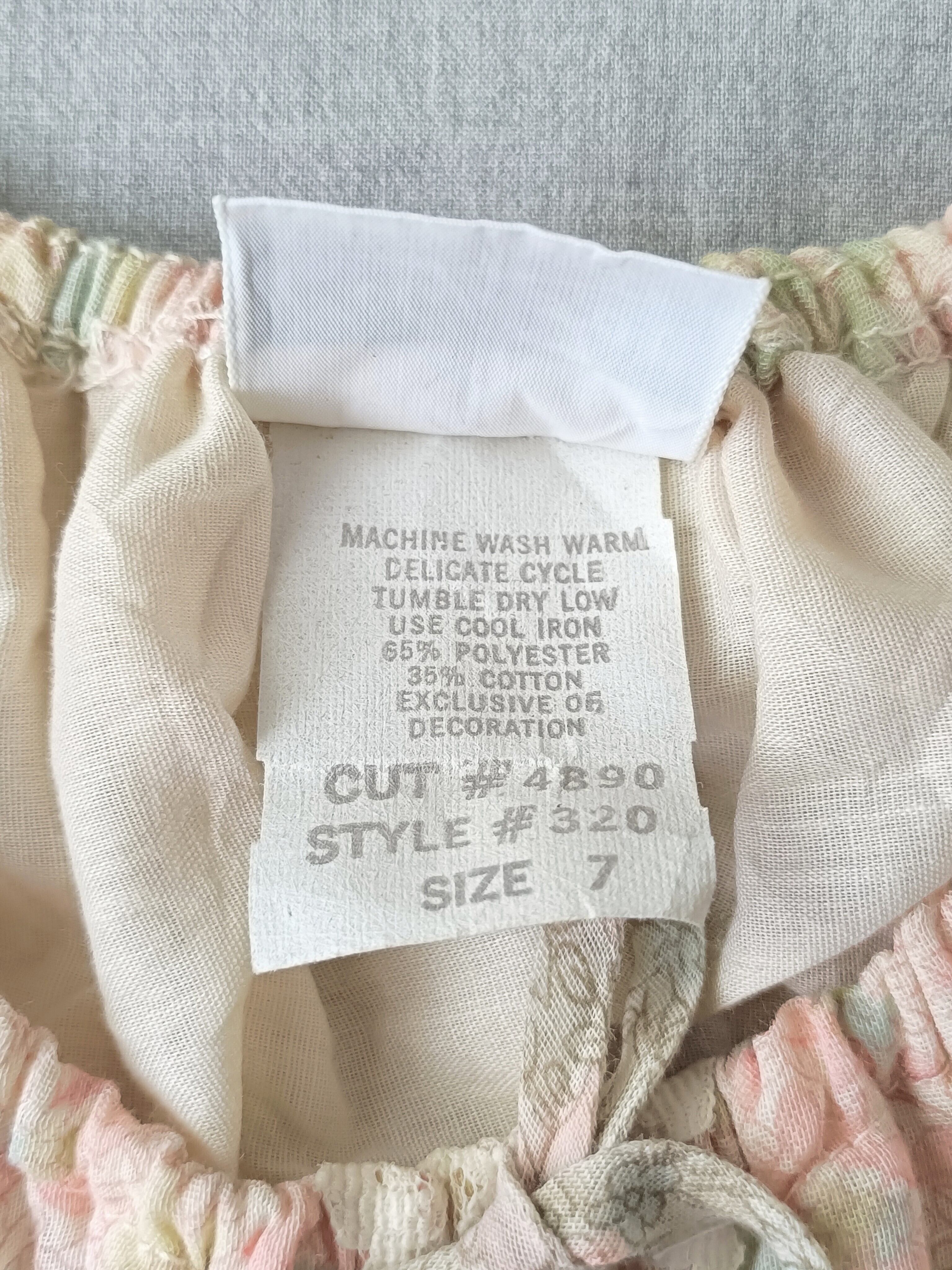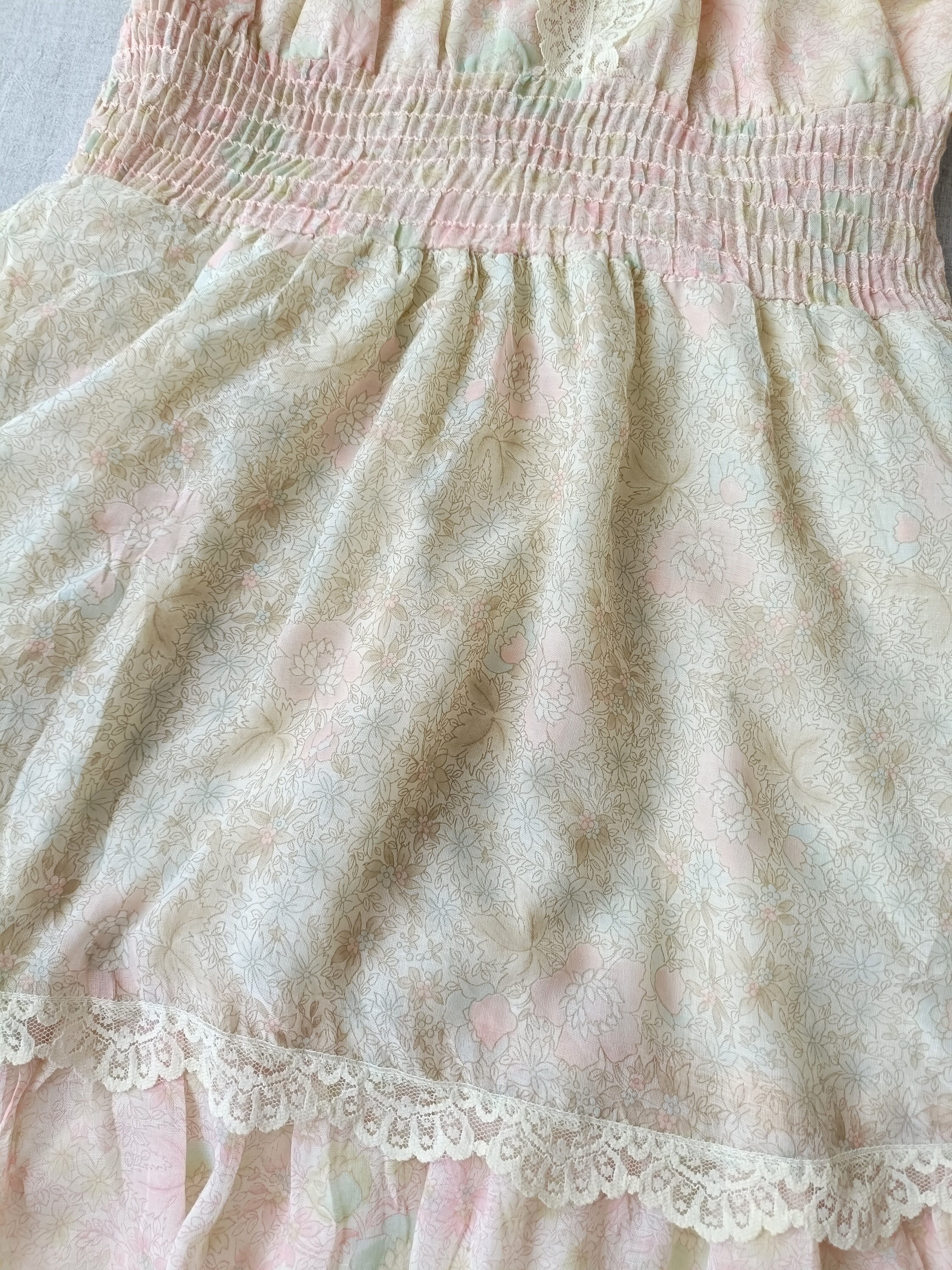 春夏に似合う爽やかなオフホワイト、ピンク、ブルーの小花柄生地の3段ティアードマキシ丈ドレス。