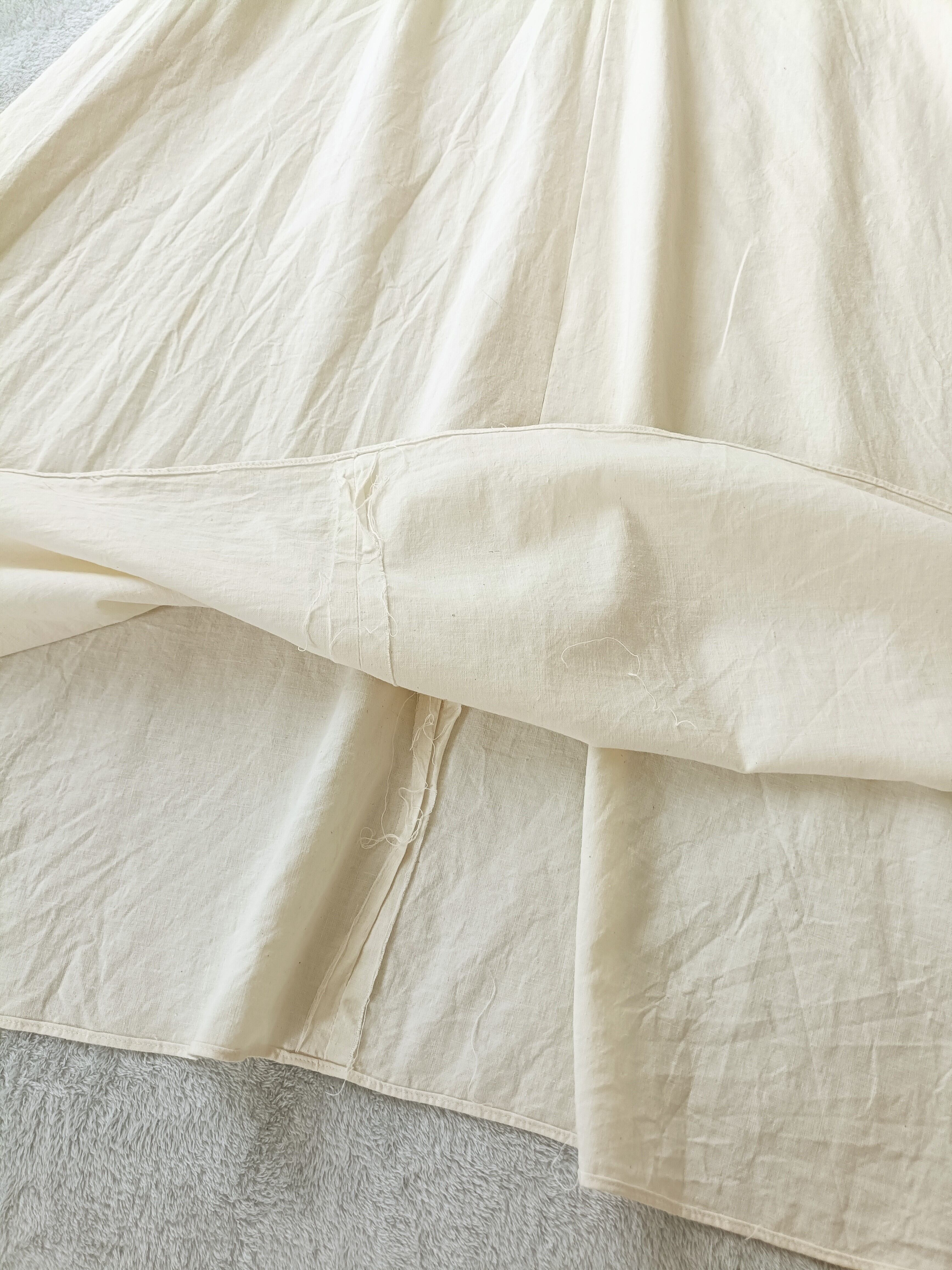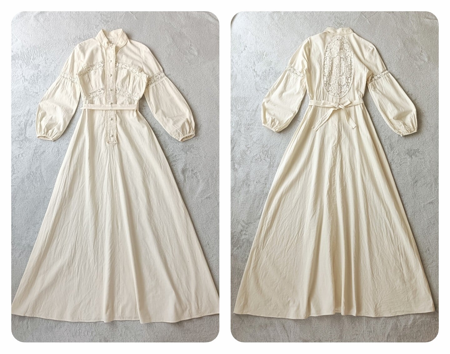 後ろ身頃のレースが印象的なコットンドレス。生地はシーチングのような素朴な生地感です。