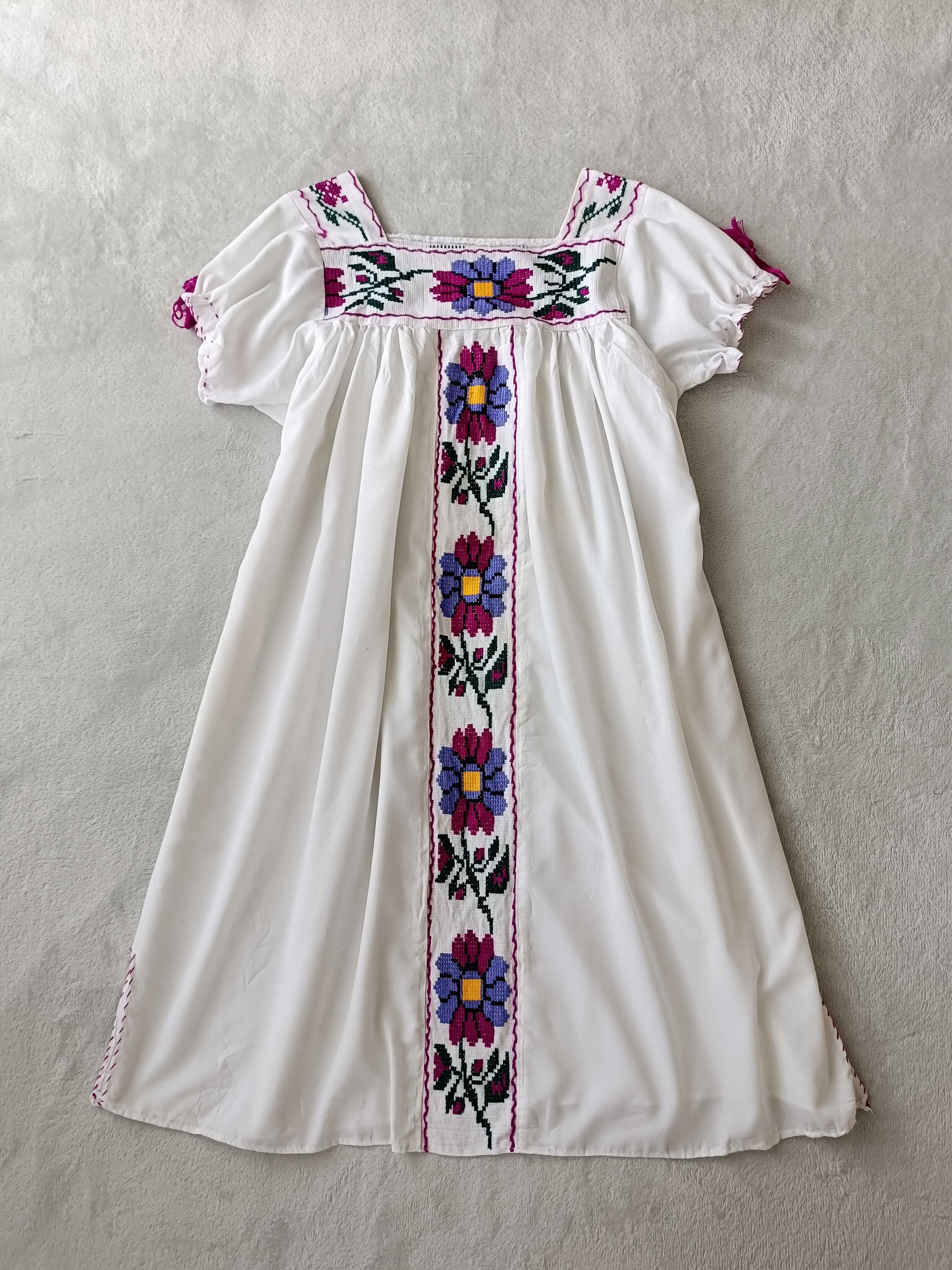 現地メキシコ刺繍職人によって作られた、カラフルな刺繍と手作り感のある温かみのある雰囲気のワンピース。