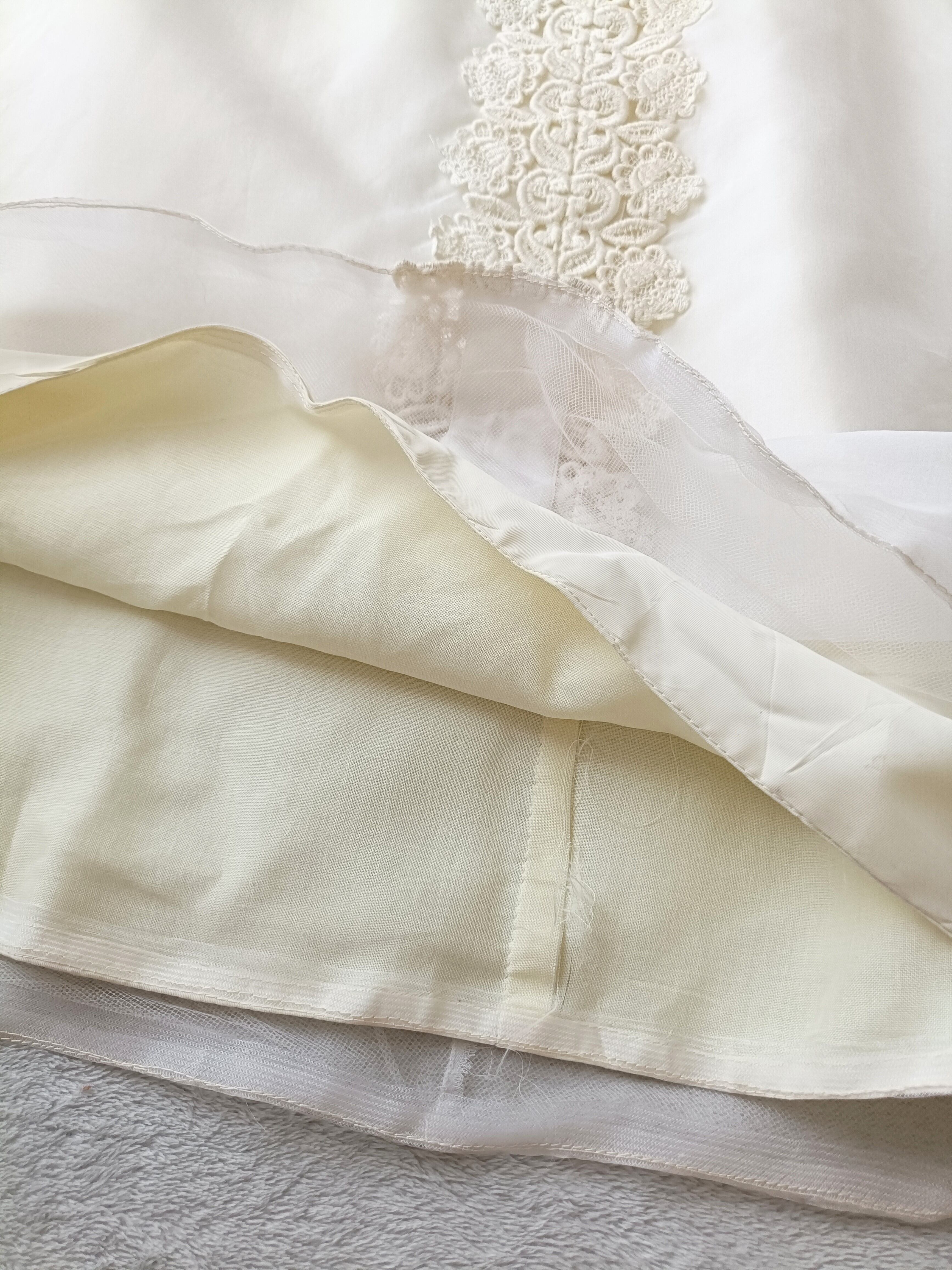 【コンディション】A もともとの縫製で後ろ中心レースの合わせズレと、襟のリボンがやや中心からズレています。前身頃に小さい穴が1列に何箇所かありますが、規則正しくあるので縫製する時にできた穴かな?と思われます。