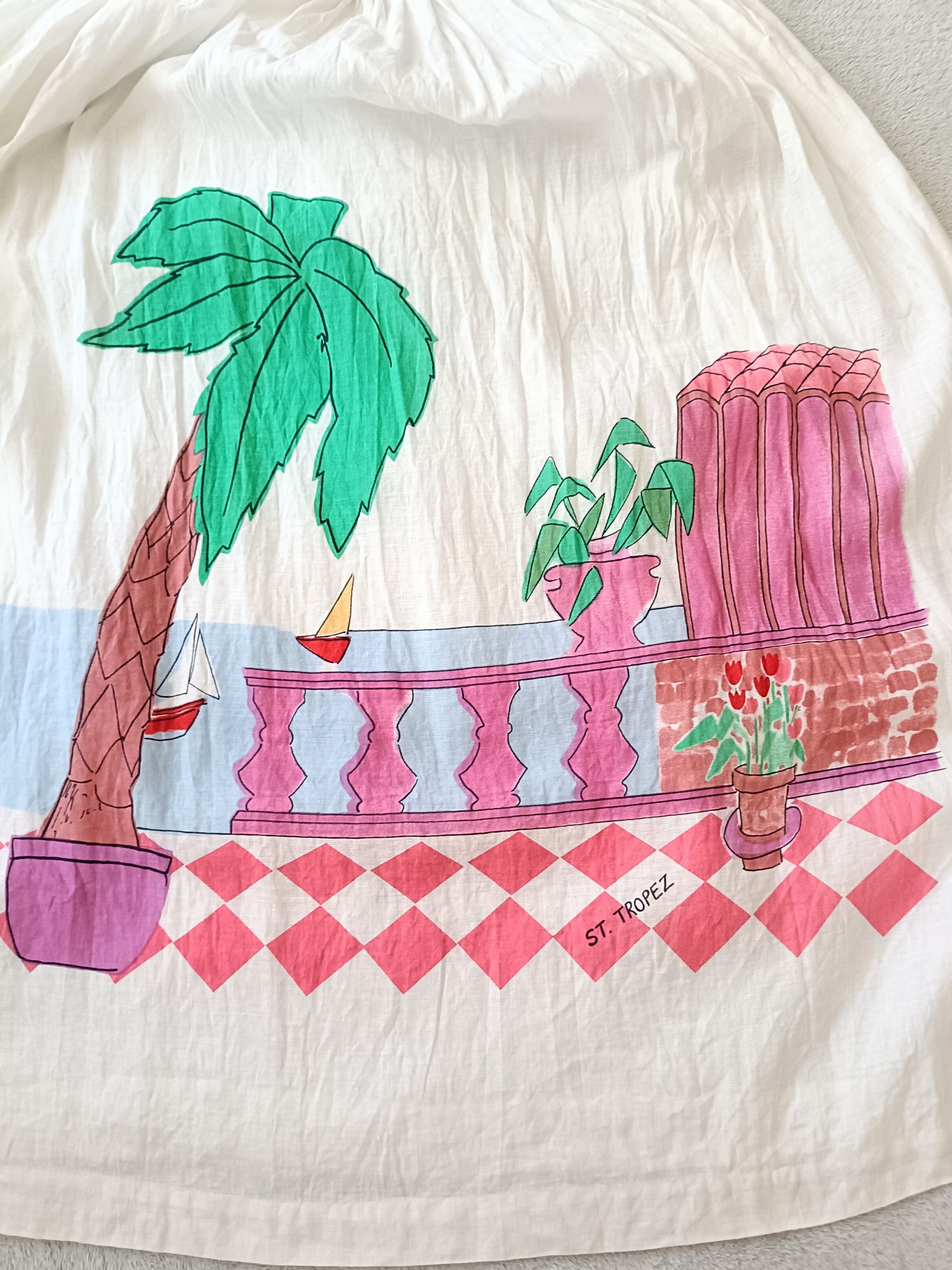 薄手で通気性のある綿麻素材。手描き風プリントが涼し気なロングスカートです。