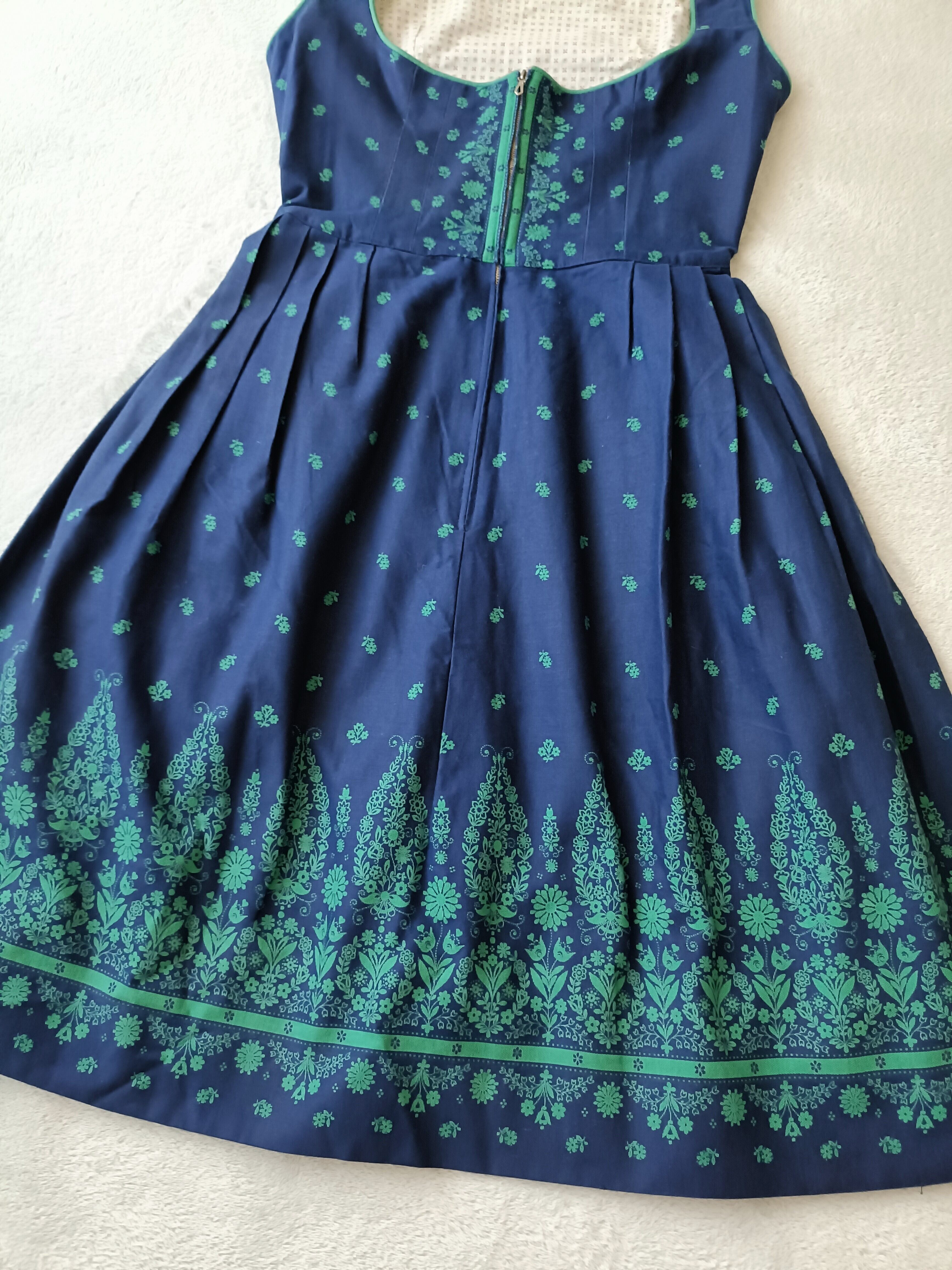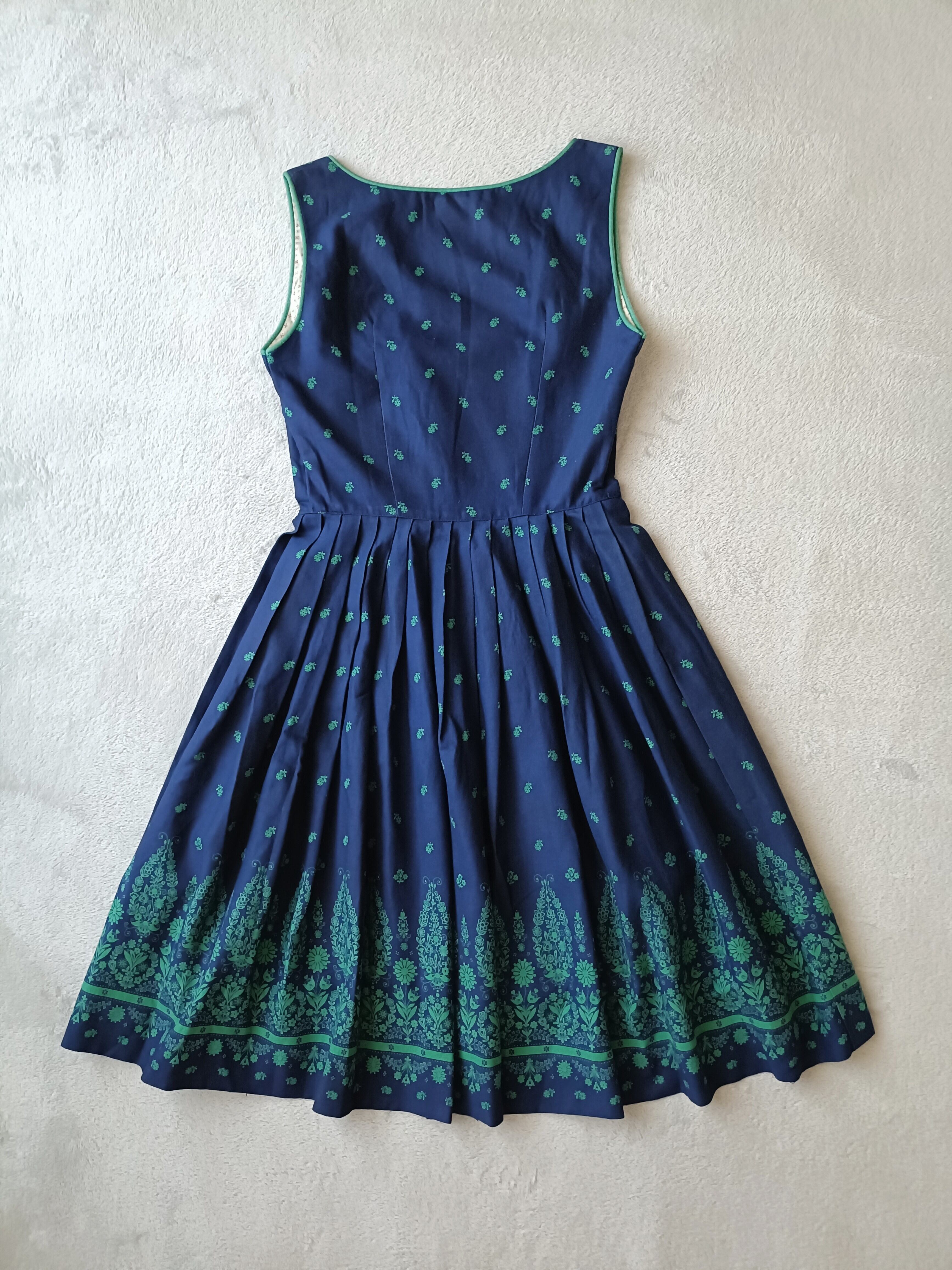 深みのあるネイビー地に、グリーンの小花柄と植物模様が映える一着。
