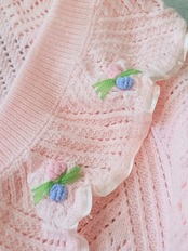 淡いピンクカラーにフリルと小花刺繍があしらわれた、ヨーロッパヴィンテージカーディガンです。