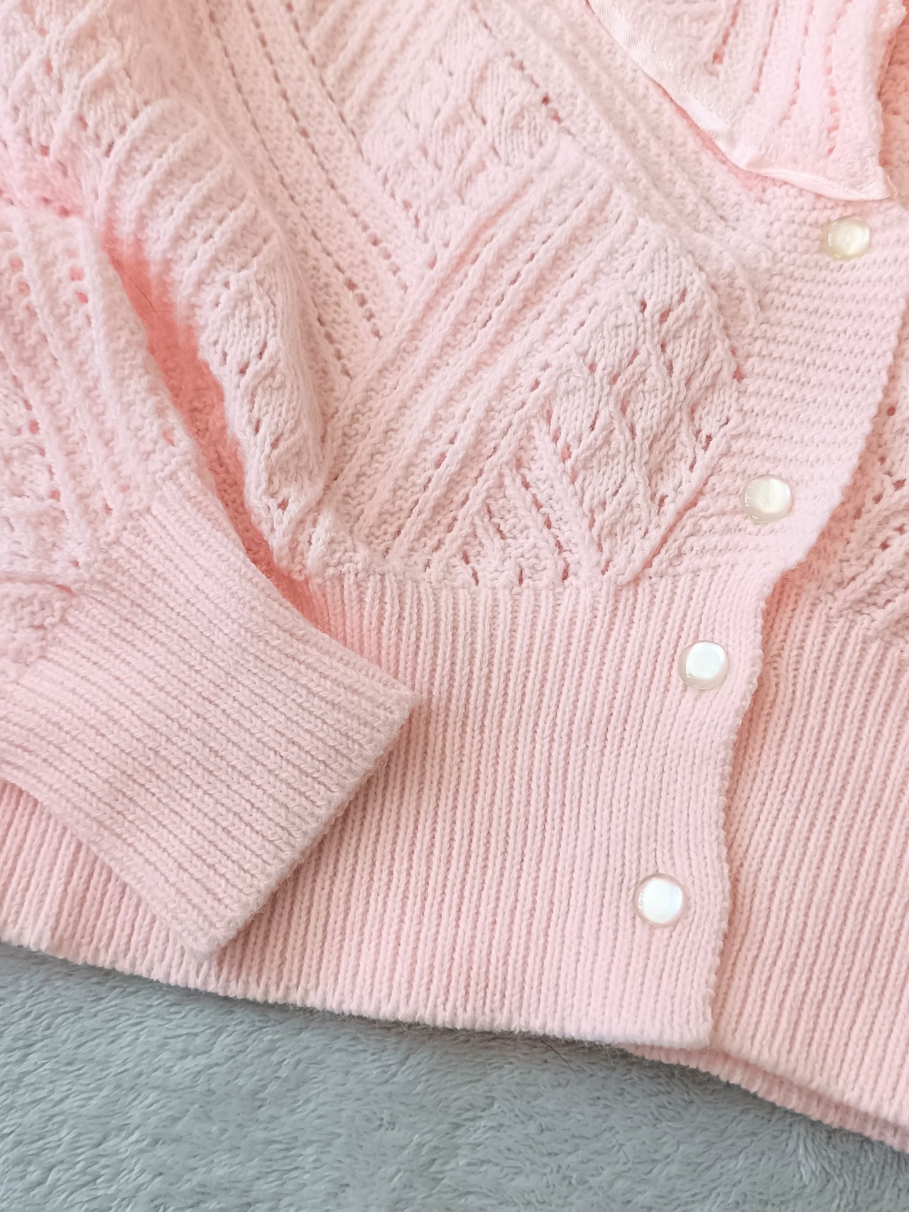透かし編みデザインで軽やかに着られ、春先や秋口にもぴったり。羽織るだけでガーリーな雰囲気☻