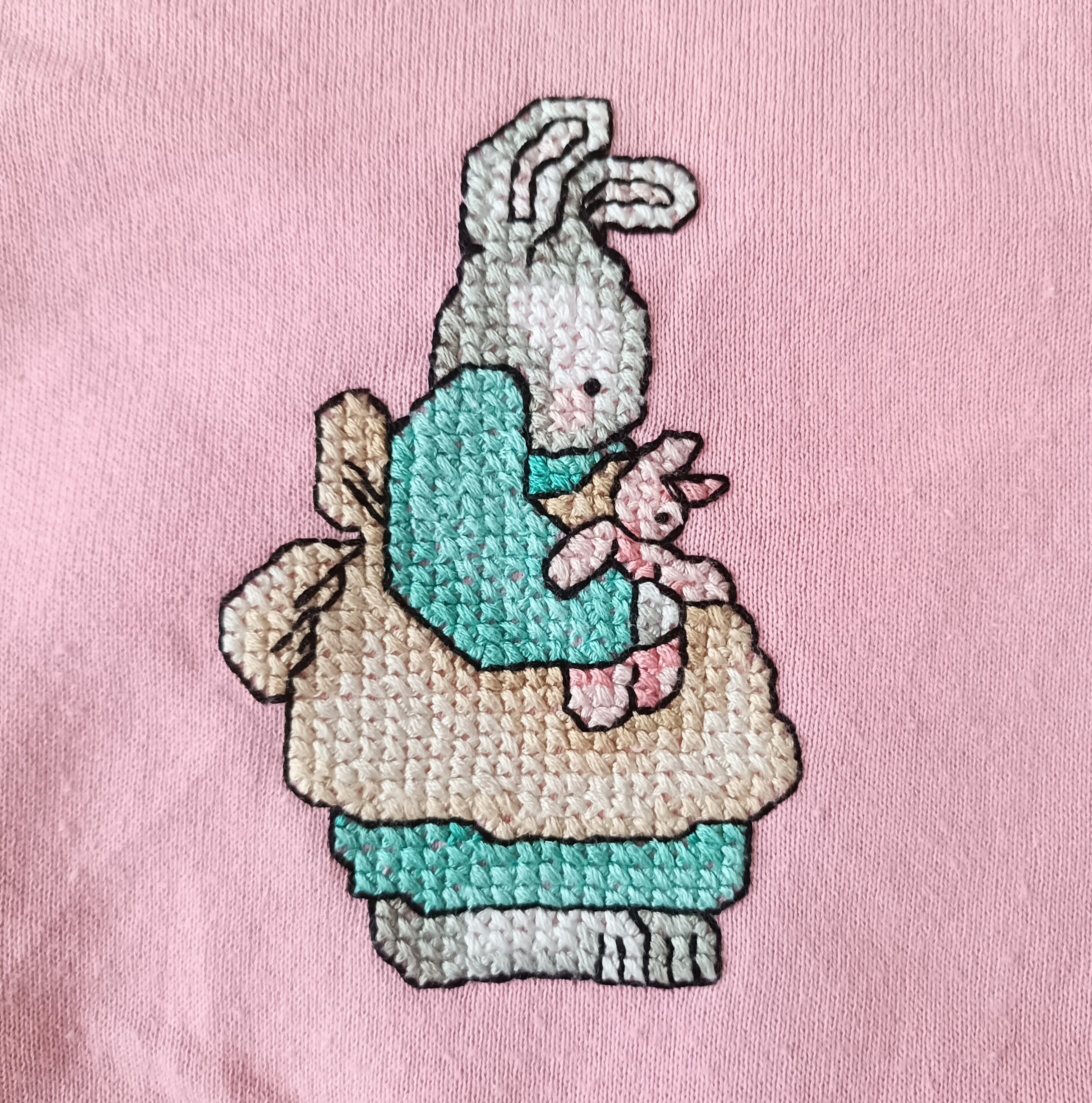 ピンクボディに、中央には愛らしいメルヘンなうさぎのモチーフがクロスステッチで刺繍されています。こちらは、おそらく後から誰かの手によって施されたカスタム刺繍で、世界に一つだけのデザインとなっています*