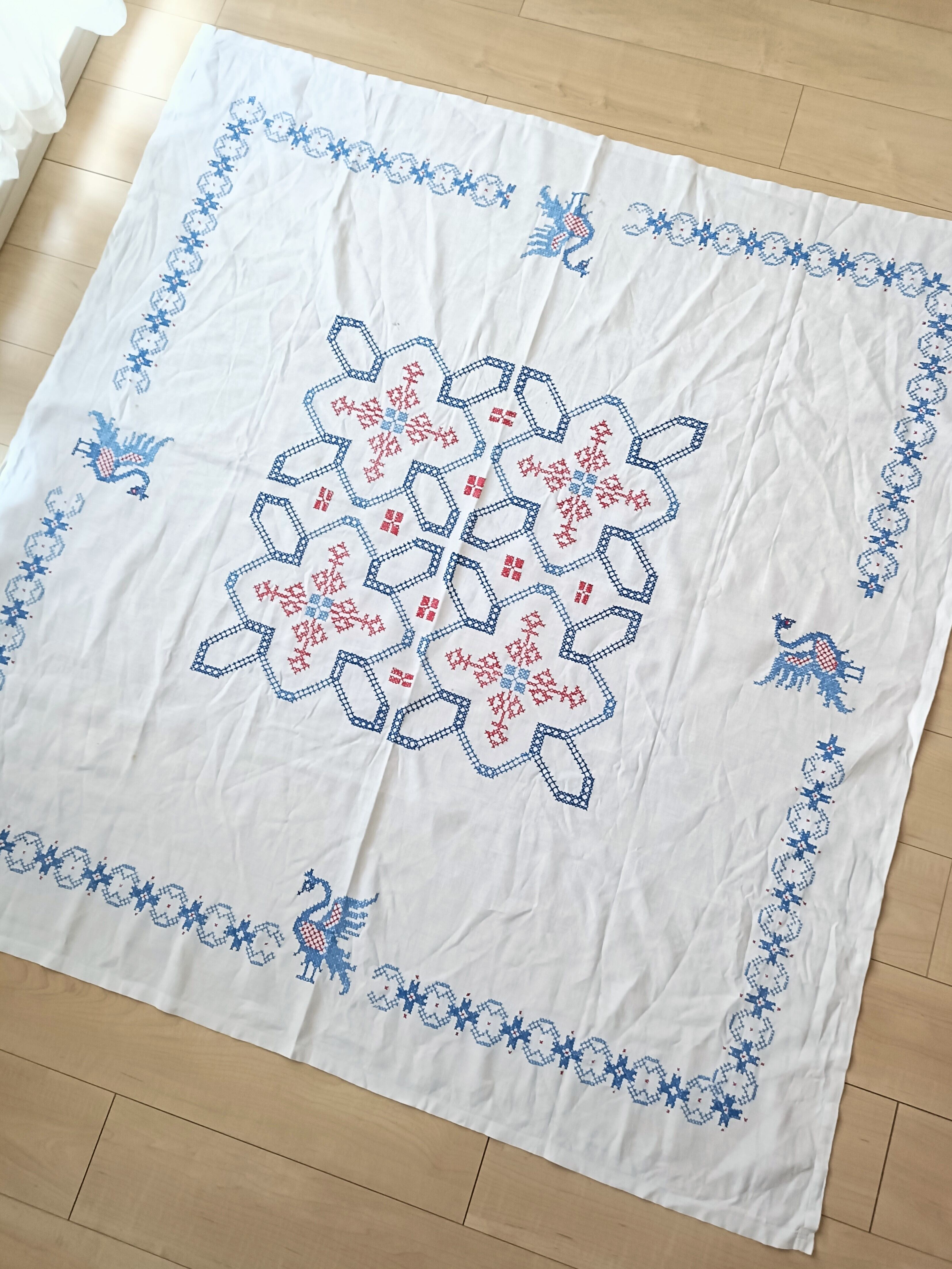 おそらく特徴から東欧(ウクライナかルーマニア周辺)のものと思われる、手刺繍のクロスステッチが美しい大判サイズのベッドカバー/テーブルクロスです。