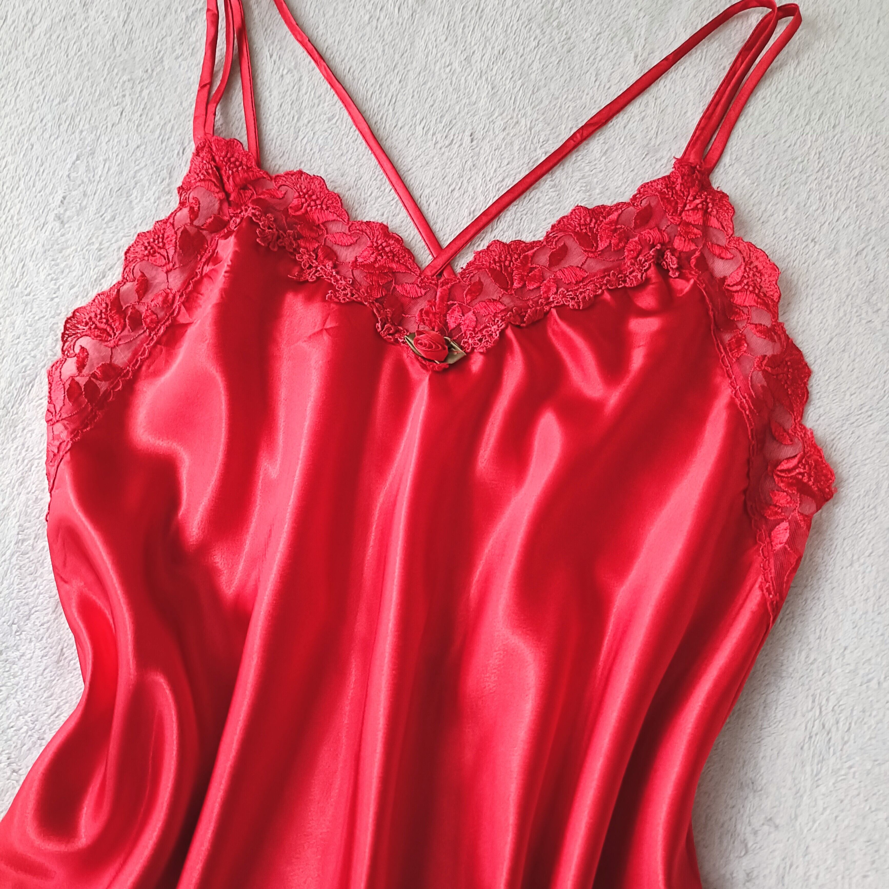 California Dynasty Luxurious Red Satin Slip Dress with Lace Trim
