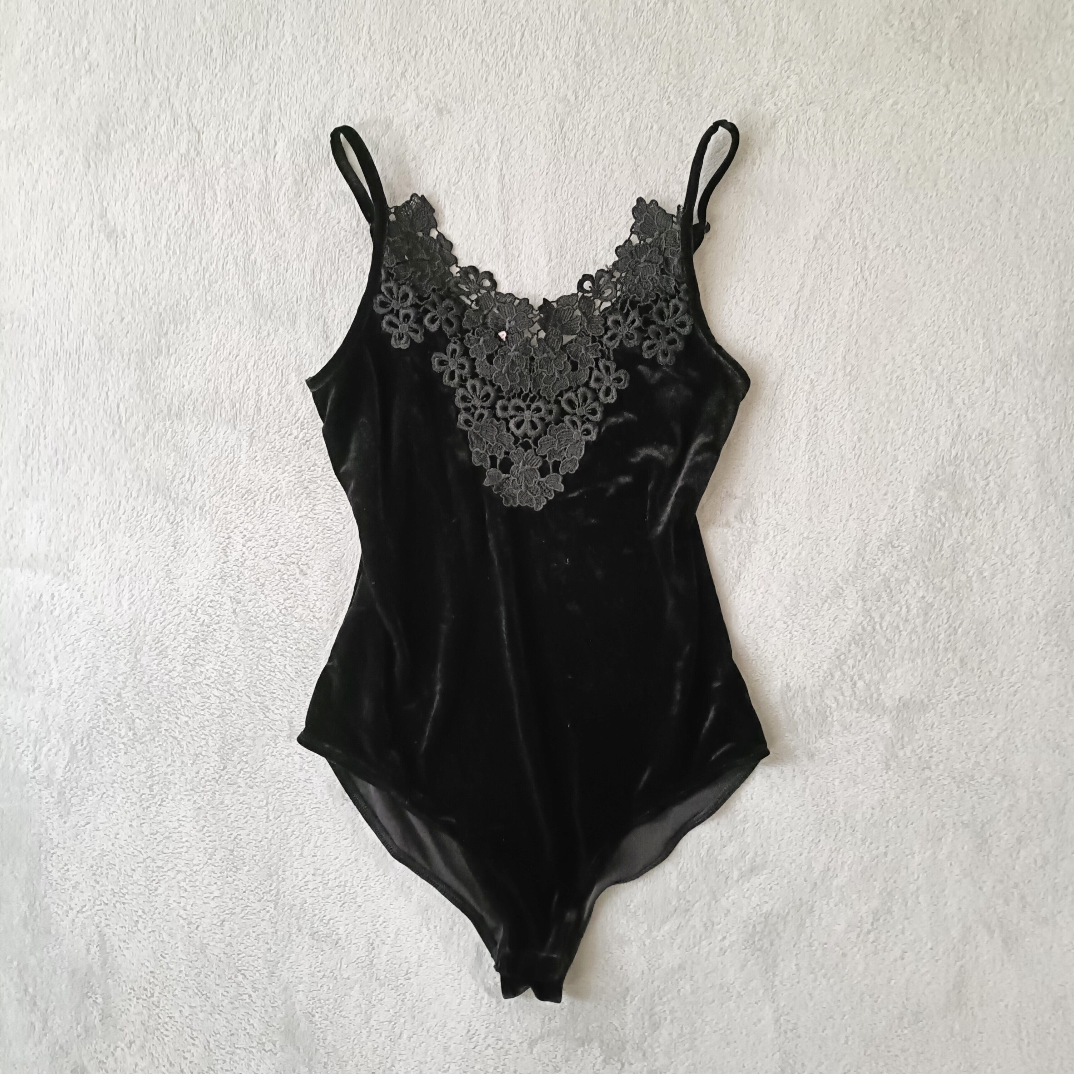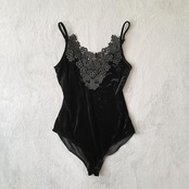 肌触りの良いベロア素材と、デコルテ部分にあしらわれた繊細な花柄のレースが可愛いアメリカブランドのボディスーツです。