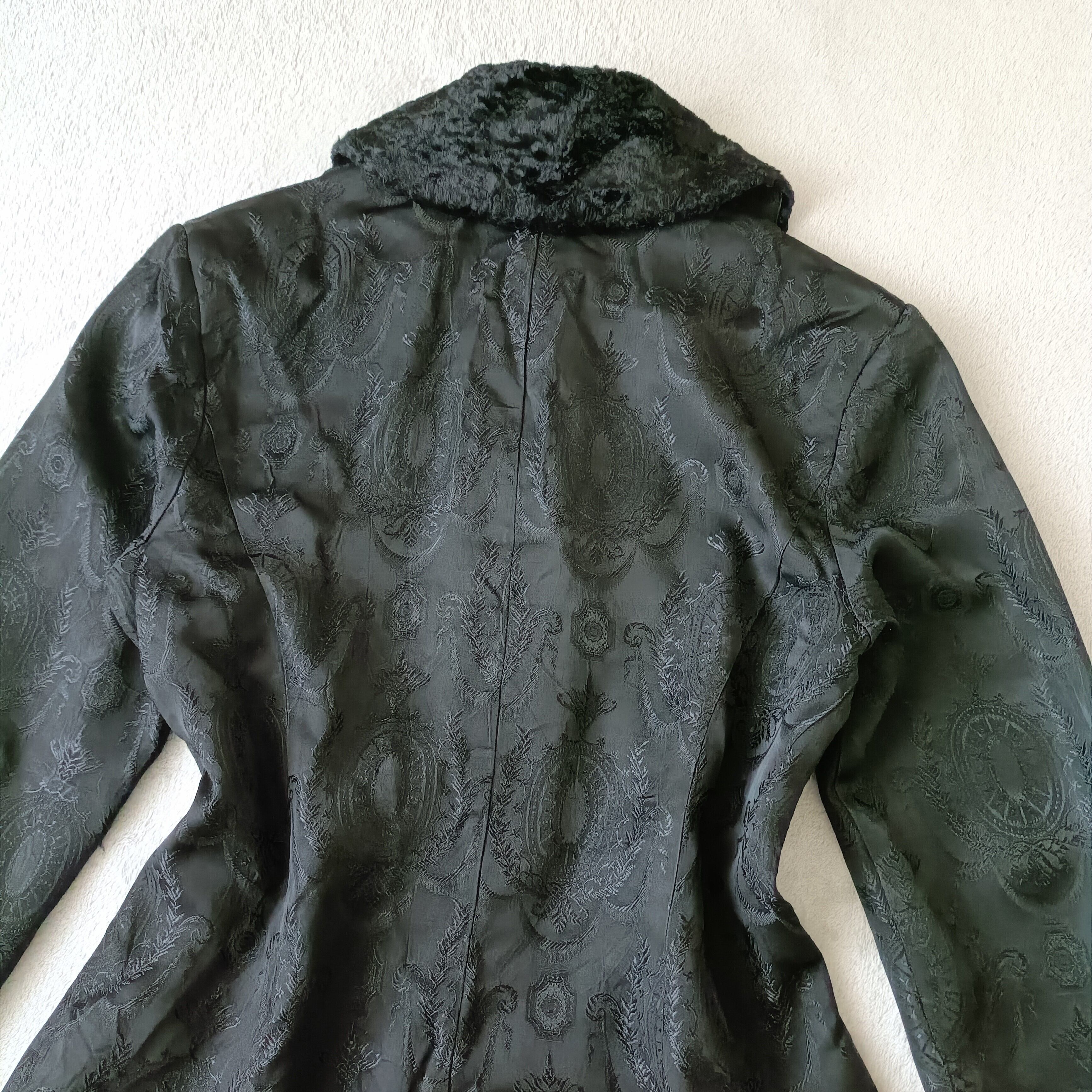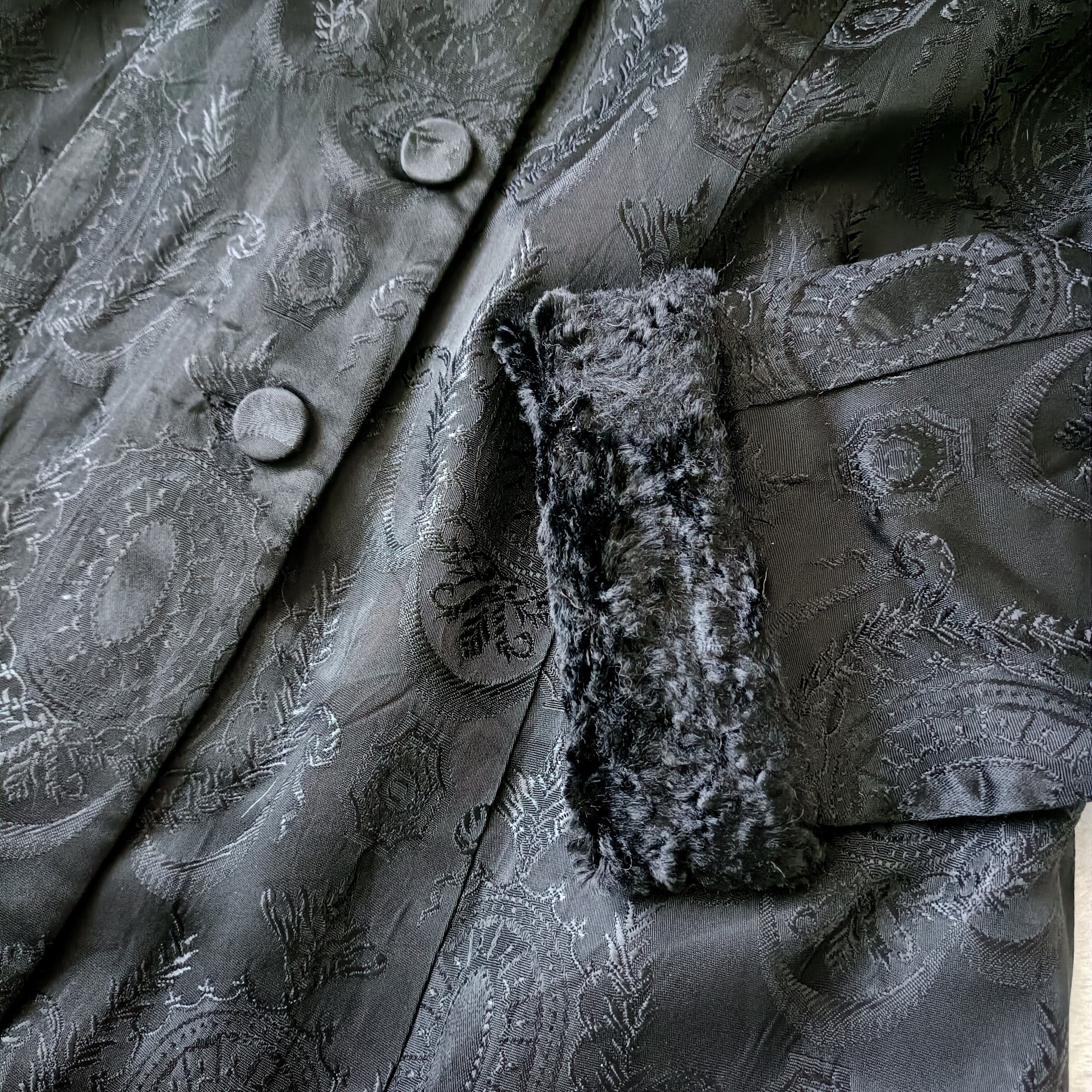 ジャガードの美しい模様と、襟&袖口のフェイクファーがクラシカルでゴージャス。ドレスコートのような雰囲気です。