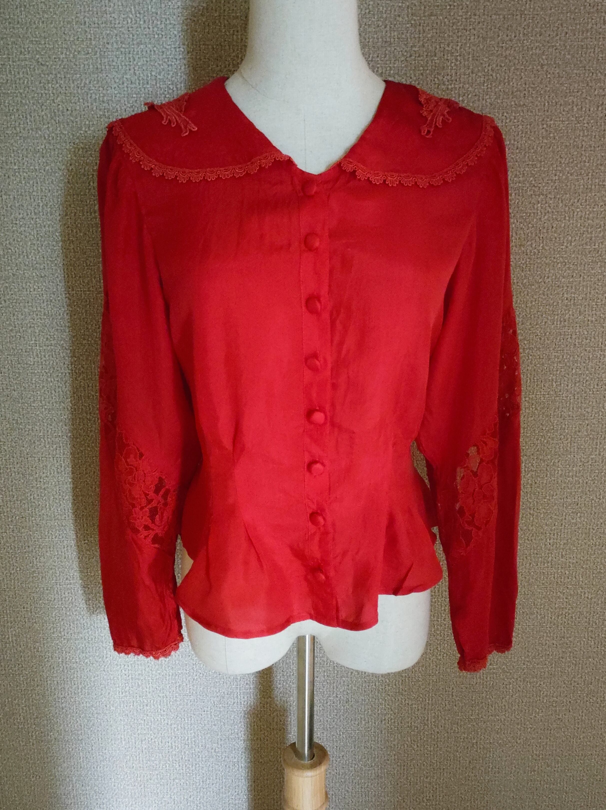 70's 80's 90's 古着 ヴィンテージ vintage ビンテージ used 古着 USA レトロ retro ブラウス blouse 長袖 セーラーカラー レッド 刺繍 花柄 スカラップ ブラウス 長袖シャツ アウター 羽織り ペプラム