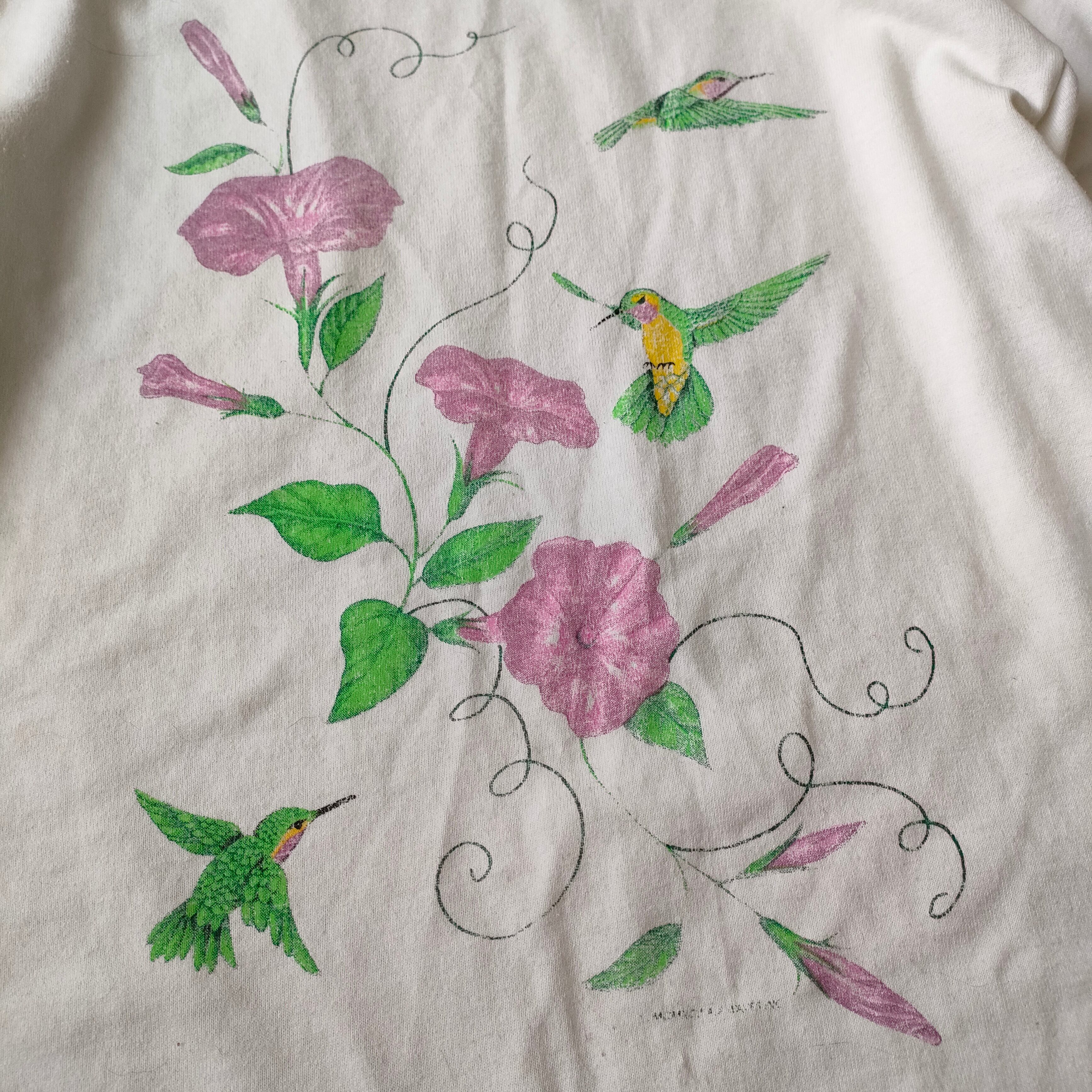 古着 USED ヴィンテージ レトロ 80年代 ゆるダボ 猫 アニマル プリントTシャツ ロリータ デコラ 80's 90's 可愛い 半袖 夏 アメリカ古着 USA アート系プリント 古着 鳥 ウグイス 花柄 大きめ レディース